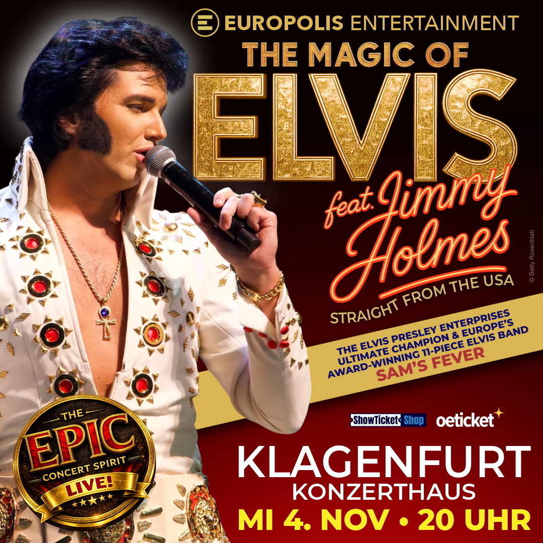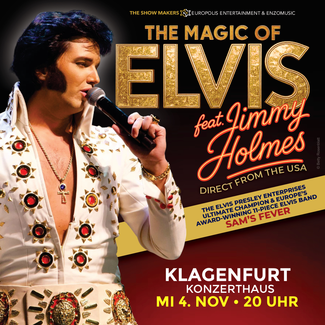 Mit der Concert Show THE MAGIC OF ELVIS feat. JIMMY HOLMES erwacht die Faszination, der Sound und die unvergessliche Energie von ELVIS PRESLEY zu neuem Leben. Der charismatische Sänger JIMMY HOLMES aus den USA, einer der authentischsten und neuen Superstars unter den Elvis-Interpreten unserer Zeit, bringt mit seiner beeindruckenden Stimme, seinem unverwechselbaren Stil und seiner Bühnenpräsenz die Magie des King auf die Bühne zurück. Unterstützt wird er von der wahrscheinlich besten und mehrfach ausgezeichneten ELVIS Band Europas SAM’S FEVER - die mit kraftvollem Rock’n’Roll, gefühlvollen Balladen und mitreißendem Groove das Lebensgefühl der 50er, 60er und 70er Jahre wieder auferstehen lässt.